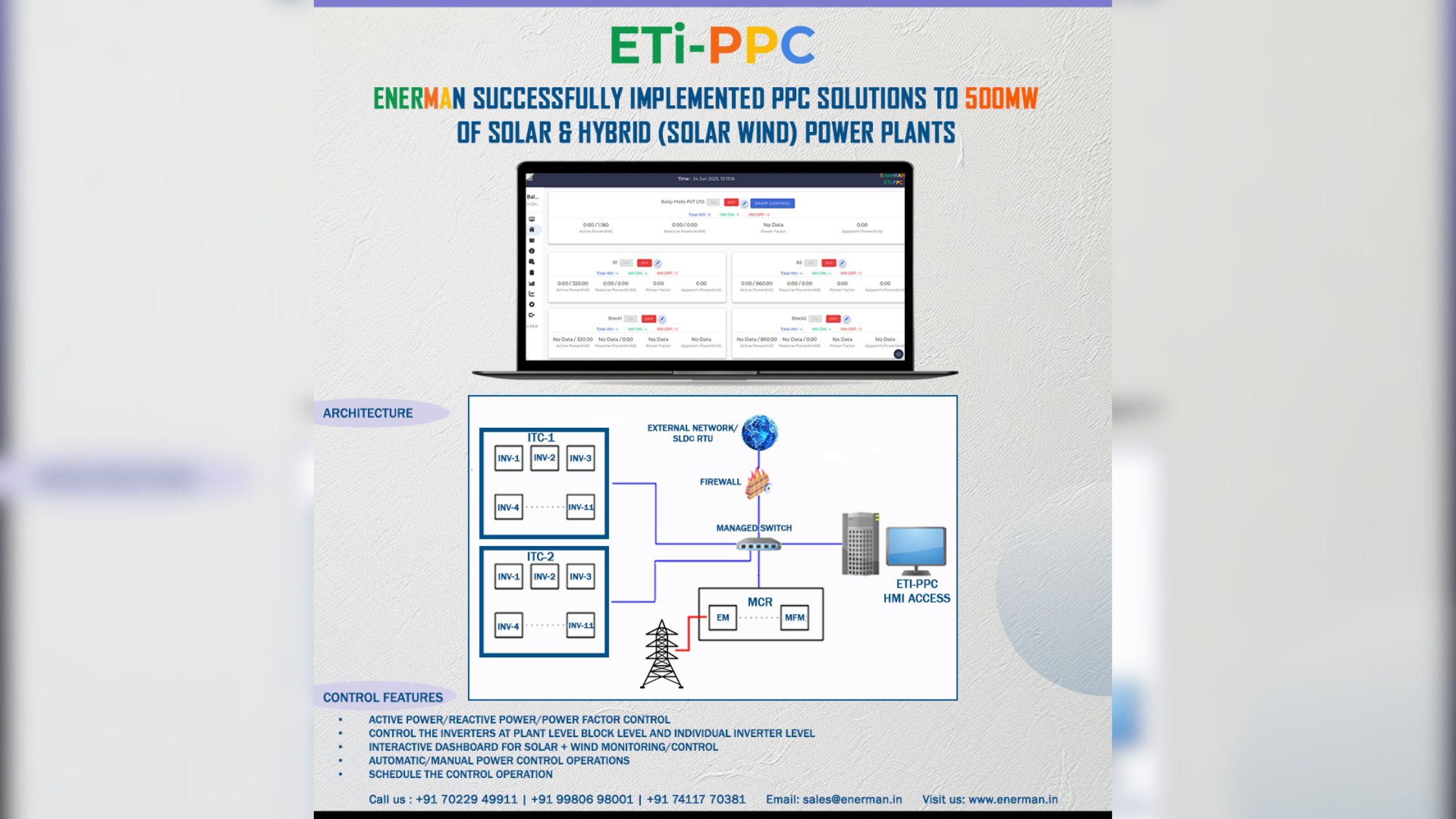 This is particularly important when using unsteady or weak grids. The ETi-PPC framework has been developed in strict adherence to the latest Central Electricity Authority (CEA) guidelines, ensuring compliance with technical, safety, and operational standards as prescribed under the Indian Electricity Act.For electrical generation and distribution systems to operate steadily, effectively, and reliably, Plant Power Control (PPC) are essential. PPC makes it possible for better voltage regulation, lower T&D losses, and improved power quality & stability by precisely controlling active power, reactive power, and power factor. Reactive power compensation in response to grid voltage deviations and dynamic power factor adjustment based on load conditions are examples of advanced control strategies that enable smooth integration with the utility grid and statutory grid code compliance. Reliable performance is further ensured, even during unmanned operation, by the use of scheduled and autonomous control functions. PPC systems continue to be an essential part of contemporary power system infrastructure as the need for grid stability and energy efficiency grows, particularly in industrial and renewable-integrated plants.