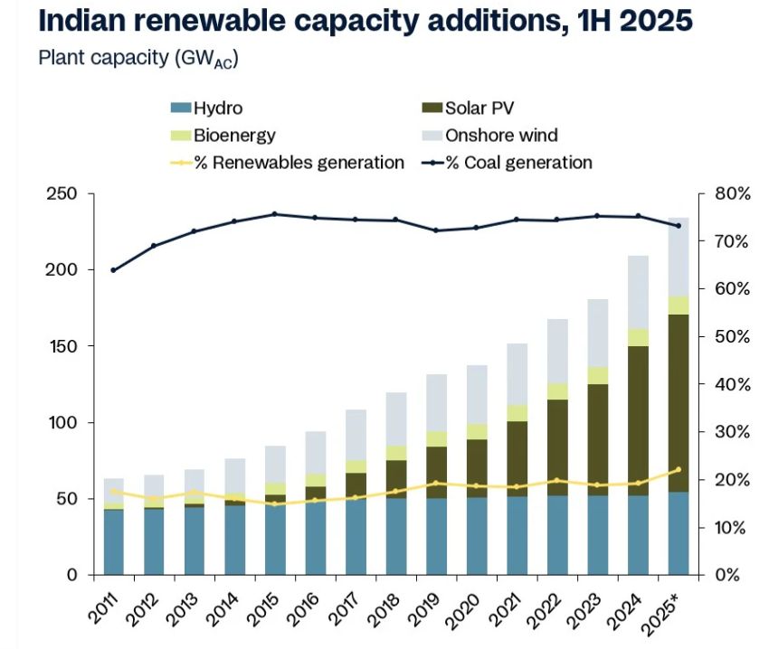 While India celebrates a record-breaking 22 GW of renewable energy capacity additions in the first half of 2025—a 57% increase from the same period last year—the broader energy landscape reveals a more complex and dual-track strategy. The country’s clean energy progress is impressive, but it coexists with aggressive expansion plans for coal-fired power, raising doubts about whether India is truly transitioning or merely diversifying its energy mix.