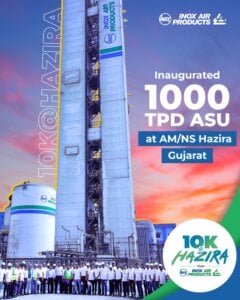 INOX Air Products (INOXAP)’s industrial gas complex in Gujarat has broken through the 10,000 tonnes per day (tpd) gases barrier, following the commissioning of its new 1,000 tpd plant at AMNS Hazira, where a giant steel plant is under construction.