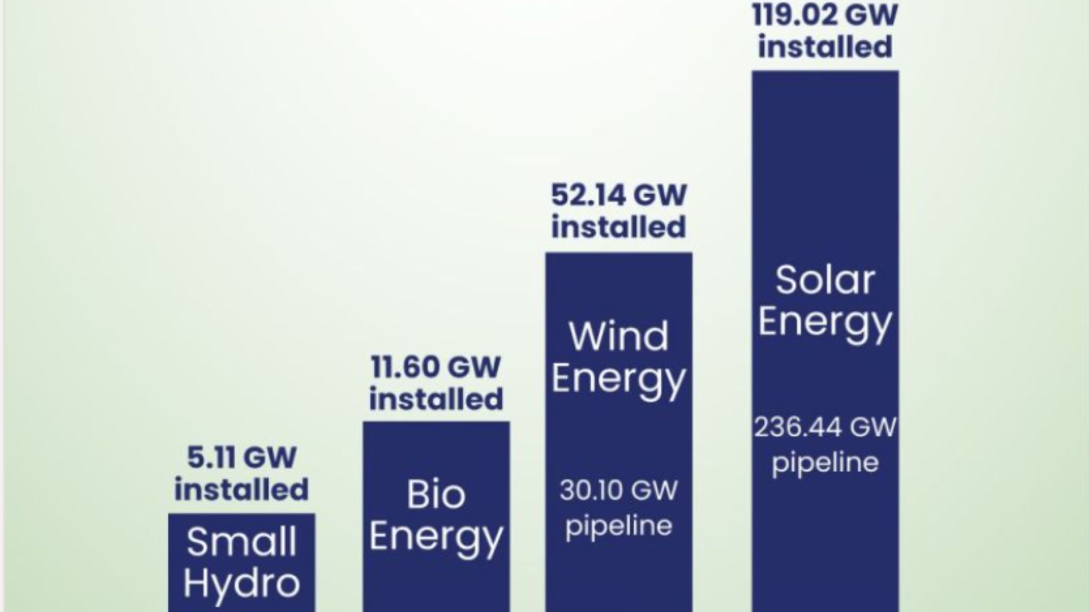 According to MNRE data, solar power leads the segment with 119.02 GW, followed by wind power at 52.14 GW, bio-energy at 11.60 GW, and small hydro at 5.11 GW.