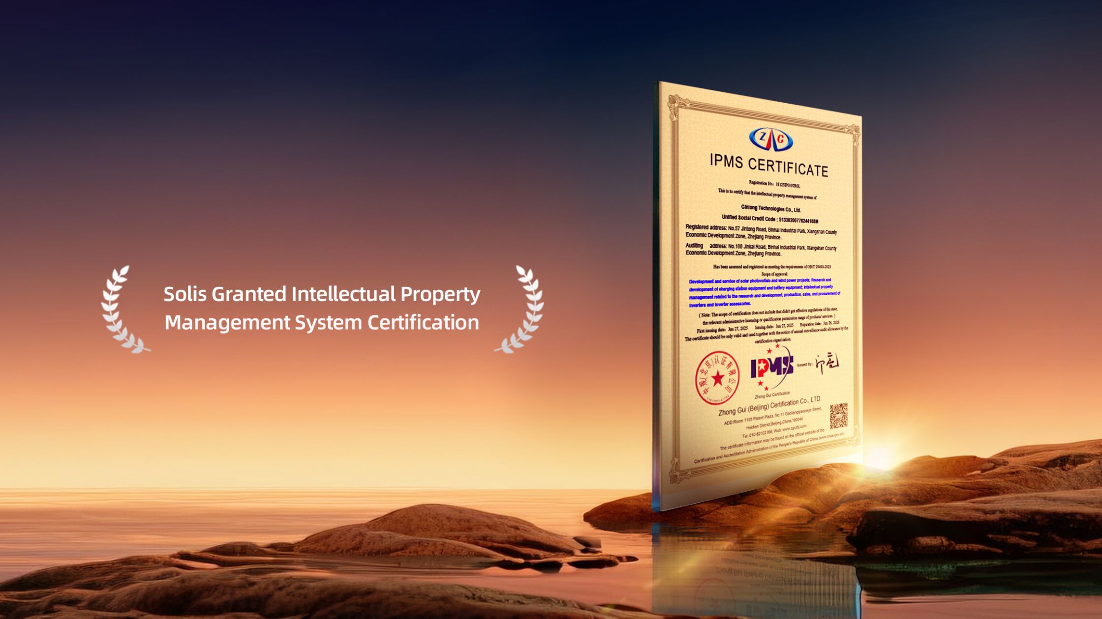 Solis, a globally recognized leader in photovoltaic inverter manufacturing, has officially received the Intellectual Property Management System Certification by Zhong Gui (Beijing).
