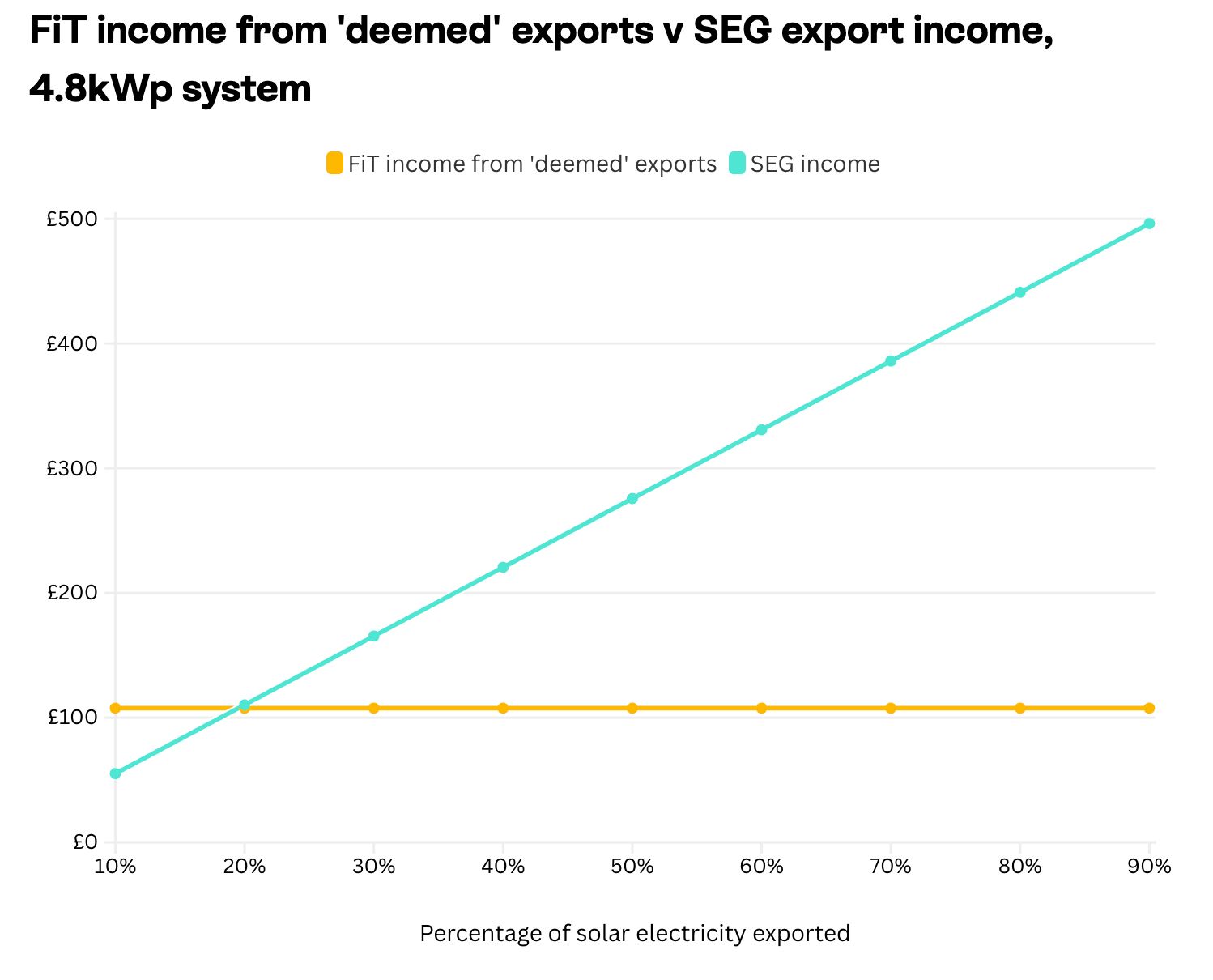 • At 90% export, the SEG rate delivers £496, compared to £273 under FiT—a difference of £223.